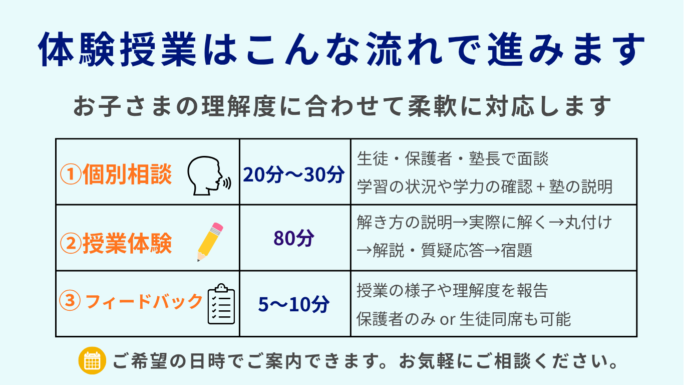 無料体験授業のお申し込みは、お電話または下記お申込みフォームにて受け付けております。